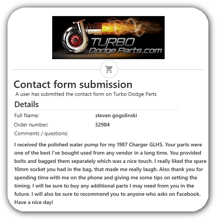 When potential customers are researching us online, they're initially getting to know us primarily by way of the content of our website. Understandably, many of our Internet site guests are seeking “social proof” that we are a trustworthy supplier of products and a knowledgeable provider of sage turbo Dodge advice. With these thoughts in mind, we would like to introduce you to the turbo Dodge "Brand Ambassadors" and their online social media comments. We often are pleased to see our name mentioned in a positive light as well as to receive the occasional hand written notes in the US Mail.