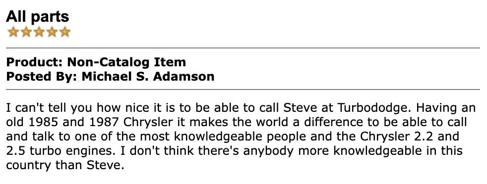 When potential customers are researching us online, they're initially getting to know us primarily by way of the content of our website. Understandably, many of our Internet site guests are seeking “social proof” that we are a trustworthy supplier of products and a knowledgeable provider of sage turbo Dodge advice. With these thoughts in mind, we would like to introduce you to the turbo Dodge "Brand Ambassadors" and their online social media comments. We often are pleased to see our name mentioned in a positive light as well as to receive the occasional hand written notes in the US Mail.